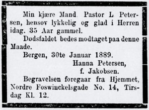 – etter at denne svært aktverdige unge metodist-pastor Lars Petersen gikk bort i familiens bolig i «Nordre Foswinkelsgade 14» i Bergen bare 35 år gammel 30. januar 1889 – hans 35 årsdag var nettopp markert dagen forut, den 29.