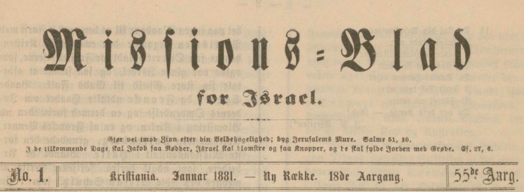 – utgitt januar 1881 – «Ved Nytaarstid»; og et tilbakeblikk på den evangeliske misjon blant verdens jøder fra dens reelle oppstart under såkalt «pietistisk» innflytelse, da den kristne kirkes skyldighet for jødenes frelse alvorlig var erkjent; den neste artikkel i nr. 2/1881 følger;