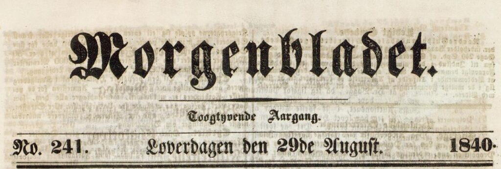 – og på førstesiden i Christiania-avisen «Morgenbladet» for den påfølgende dag «Løverdagen den 29de August 1840»; minneordene kan veldig gjerne være skrevet av bladets redaksjon og redaktør Adolf (Adolph) Bredo Stabell, selv en markant personlighet; tonen i ordene er den samme som den vi finner hos presten Christian Delphins minnedikt omtrent samtidig – en høyaktelse for Poul Holsts karakter og rettsinn;