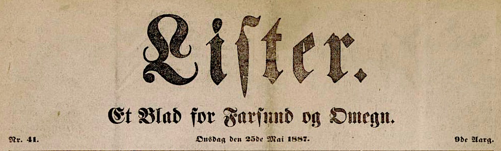 – presentert som del av artikkelrekken med samme tittel i avisen “Lister – et Blad for Farsund og Omegn” 18. mai, 25. mai og den avsluttende 28. mai 1887;