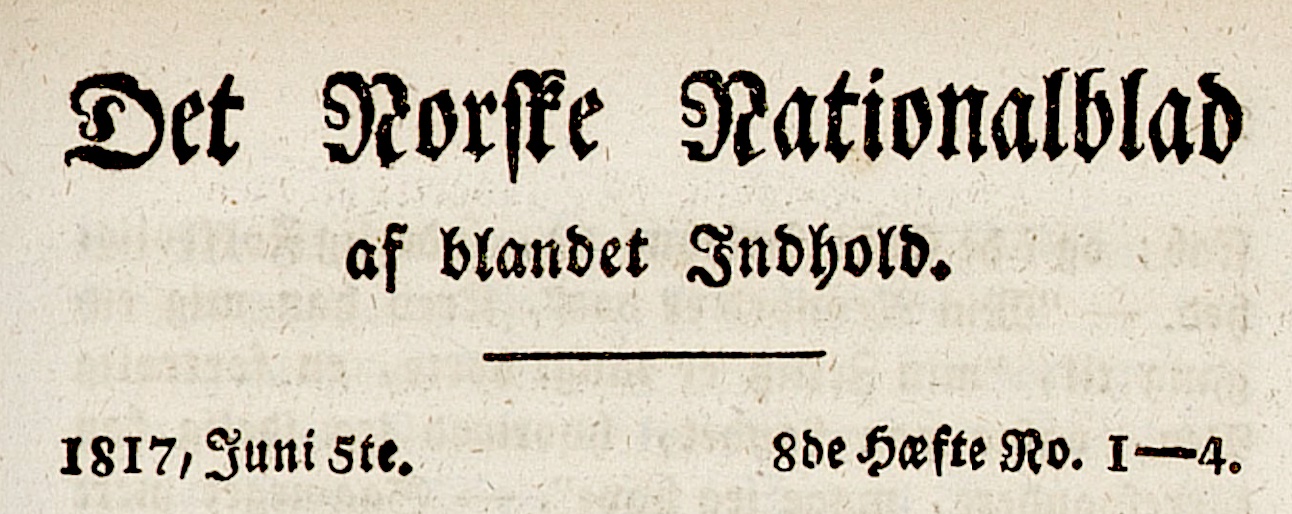 – og inntatt i «Det Norske Nationalblad af blandet Indhold» for «1817, Juni 5te.»; dikterpresten Jens Zetlitz hadde en stund tidligere i samme blad offentliggjort sitt «Mindedigt over Biskop Brun», aktede og avholdte bergensbispen Johan Nordahl Brun, som var gått bort i Bergen 26. juli 1816. Bak dette blad – utgitt i Christiania – stod «Boghandler Hans Abel Hielm», godt støttet av sin eldre bror Jonas Anton Hielm, den kjente sakfører og politiker i hovedstaden.