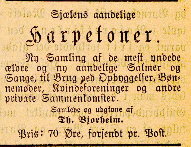 Bjorheim (les mer om ham her) var født i 1852 og gikk bort bare 37 år gammel, 28. januar 1889, etterlatende seg hustruen Guri Gjertrine Tollaksdtr., som var av samme alder, samt 6 barn under konfirmasjonsalder; som det framgår av teksten, hadde Thorstein samlet en «Ny Samling af de mest yndede ældre og ny(ere) aandelige Salmer og Sange, til Brug ved Opbyggelser, Bønnemøder, Kvindeforeninger og andre private Sammenkomster»; og han står selv som utgiver. Dessverre har vi ikke klart å oppdrive selve sangboken, hvilket format den ble utgitt i, samt hvor den ble utgitt – men siden det sies at dette er en «ny Samling», må det regnes med at Thorstein Bjorheim har utgitt noe tidligere; dette vil vi komme tilbake til så snart det er mulig å finne sangboken :