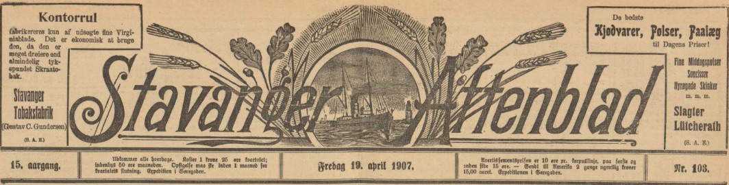 ole vollans bortgang notert i «stavanger aftenblad» for «fredag 19. april 1907»;
