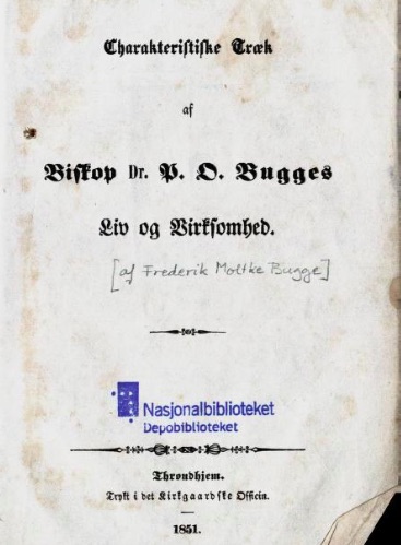 – er her gjengitt i sønnen Frederik Moltke Bugges (1806-1853) presentasjon av faren boken fra 1851 : «Characteristiske Træk af Biskop Dr. P.O. Bugges Liv og Virksomhed». Trondhjem. Trykt i det Kirkgaardske Officin; her får sønnen, forøvrig kjent fra sin virksomhet som rektor ved Trondhjem Latinskole og gikk bort knapt 50 år gammel, frem det vanskelige ved farens ulike stillingtaken til norsk personal-union med Sverige, fra det Overordentlige Storthing i oktober 1814;